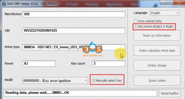 "NEC24C64-MQB (4.5 مگابایت)" و سپس "کلید دستی را انتخاب کنید" را علامت بزنید ، و سیستم بیحرکتی شناسایی را نشان می دهد ... به زودی ، خواندن داده ها… IMMO… بسیار خوب.