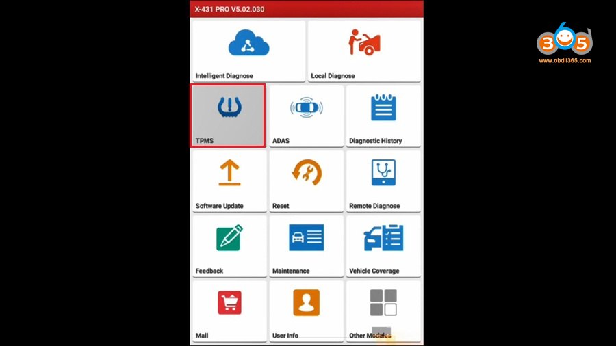 مرحله 3. به فهرست اصلی X431 V + برگردید و "TPMS" را برای تشخیص TPMS ، فعال سازی و سنسور برنامه انتخاب کنید.