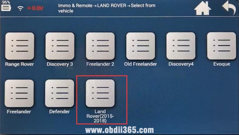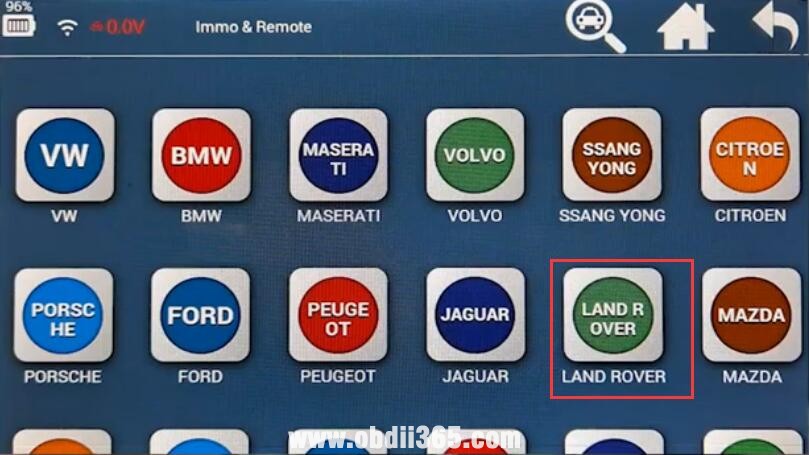 ابتدا Immo and remote-> Land Rover -> Select from вози-> Land Rover 2015-2018-> Smart key-> نوع 4 را انتخاب کنید (برنامه توسط obd) -> تمام کلید هوشمند گم شده و منتظر اتصال باشید