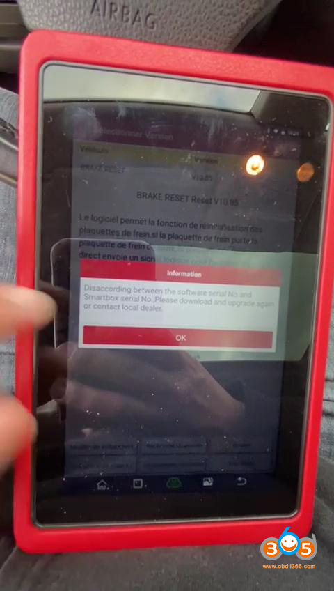 راه اندازی X43 1 جوانب مثبت کوتاه به بلوتوث متصل و توابع تشخیصی و تمام عملکرد های پیشرفته از ماشین XSARA پیکاسو، مانند بازنشانی نفت یا سایر توابع خاص تست شده، و همان پیام خطا را دریافت کرد: " Disaccording بین نرم افزار شماره سریال و شماره سریال Smartbox . لطفاً دوباره بارگیری و ارتقا دهید یا با فروشنده محلی تماس بگیرید ". من فکر کردم "عدم ثبت" در اینجا باید "عدم تطابق" باشد.