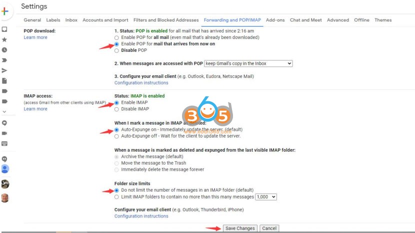 مرحله 2: POP و IMAP را فعال کرده و تغییرات را ذخیره کنید.