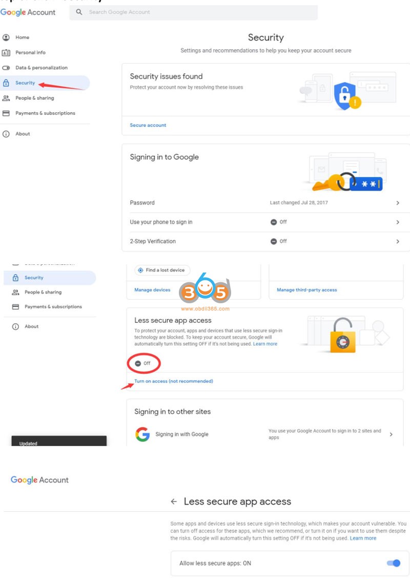 مرحله 4: "دسترسی کمتر به برنامه امن" را روشن کنید