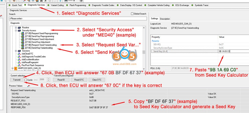 26. ECU پاسخ می دهد " 67 0B BF DF 6F 37 ". به معنی "سلام ، پین موقت BF DF 6F 37 است " برای سطح دسترسی 0B (= سطح مورد نیاز برای کدگذاری انواع حساس).