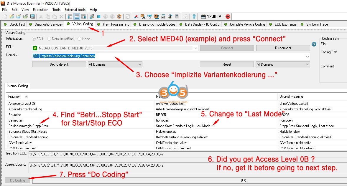 12. برای انجام کدگذاری انواع مربوط به انتشار Euro6 ، باید سطح دسترسی 0B را دریافت کنید. کارهای زیر را در تصویر زیر انجام دهید.