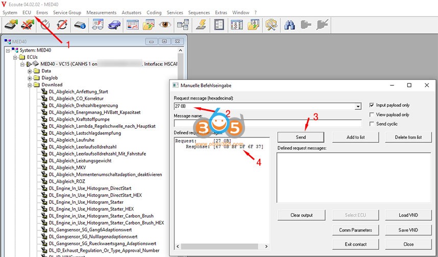 33. " 27 0C 9B 1A 69 C0 " را در ورودی دستور Vediamo / Manual… / پیام درخواست کنید و روی "ارسال"