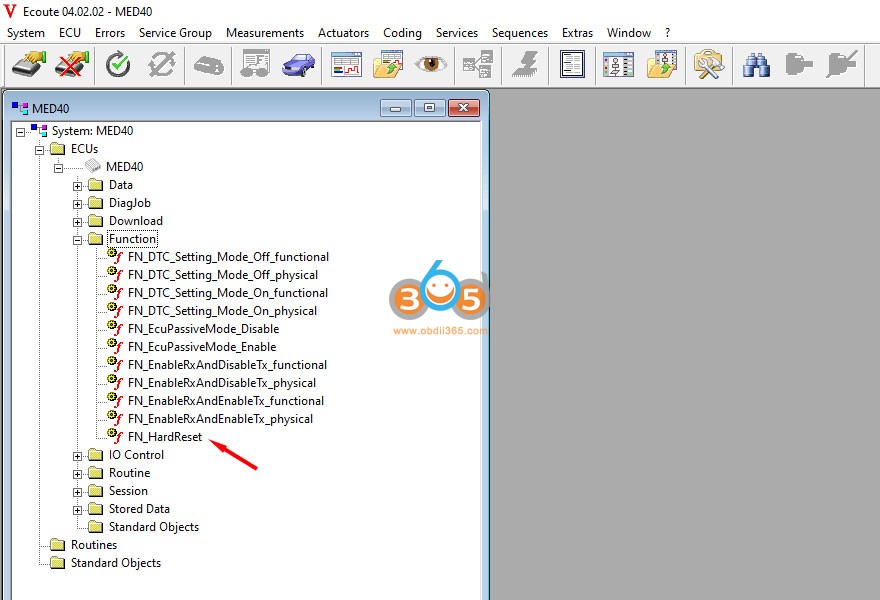 41. در پنجره سمت چپ درخت ، روی "System: MED40 / ECUs / MED40 - xxxxx / Function" کلیک کنید. می توانید "FN_HardReset" را مشاهده کنید
