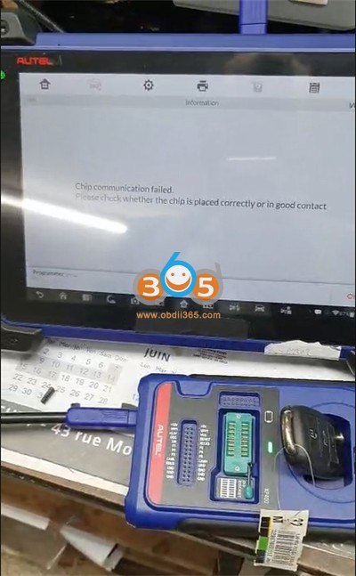 گاهی اوقات ، Autel IM608 با برنامه نویس XP400 / XP400 Pro قادر به خواندن انواع تراشه های کلیدی مانند ID46 ، 47 ، 48 ، 49 ، AES و 5C و غیره نیست ، و نشان می دهد "ارتباط تراشه شکست خورده است. لطفا بررسی کنید که آیا تراشه به درستی قرار گرفته یا در تماس خوب است "(شکل را در زیر ببینید). راه حل را از مهندس Obdii365.com بررسی کنید.